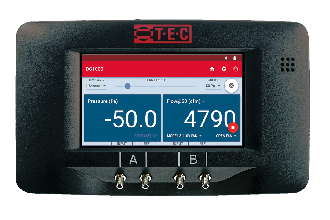 The TEC Auto Test mobile APP communicates wirelessly with the DG-1000 instrument using Bluetooth or WiFi. Automatic fan control and data collection reduces operator error and ensures each test is performed the same way. Automated testing provides quality assurance by ensuring that tests are performed according to test standards and that test data (i.e. pressure and flow readings) are collected directly from the TEC gauges and cannot be altered. Wind Assistant? This feature detects windy weather conditions and automatically adjusts envelope test settings to improve test accuracy and repeatability. Project files can be geotagged and time stamped to verify when and where testing was performed. Supports building and piping system airtight testing, and both metric and non-metric units. Test results are calculated and displayed in a PDF report that can be exported using a cloud sharing application on a mobile device. It is also possible to export complete project files (with all test and build data). Exported project files are in XML file format. Contains several default test protocols that define the test types and code compliance/test settings that an application uses when testing. Agreements can be edited, deleted, and new agreements can be created. Project and test files can be easily copied to speed data entry for large production applications Standards supported: ASTM E779 multipoint standard, RESNET 380 multipoint standard and RESNET 380 single point standard, two variants of ISO 9972 multipoint standard and CGSB 149.10 multipoint standard. Additionally, the app includes a pipe leak test standard: RESNET 380 Total Pipe Leaks