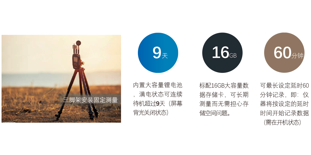 儀器內置鋰電池,滿電可連續(xù)使用超過96小時,儀器背部有標準1/4英寸三腳架接口,可連接三角架進行測量。