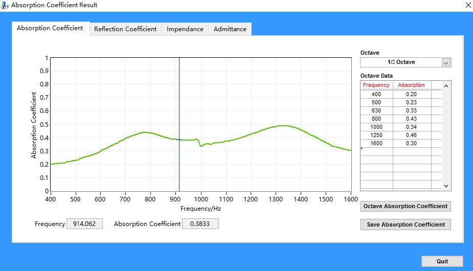 整套系統(tǒng)由阻抗管、高精度傳聲器、數(shù)據(jù)采集卡、電腦等組成。測(cè)試儀軟件根據(jù)測(cè)量到的峰聲級(jí)值和谷聲級(jí)值自動(dòng)計(jì)算出吸聲系數(shù),并能生成吸聲系數(shù)與頻率的坐標(biāo)曲線。儀器輸出信號(hào)的頻率和幅度在規(guī)定范圍內(nèi)可自由設(shè)定。由于只需少量的吸聲材料作試件,所以對(duì)于吸聲材料的參數(shù)研究和設(shè)計(jì)特別適合。